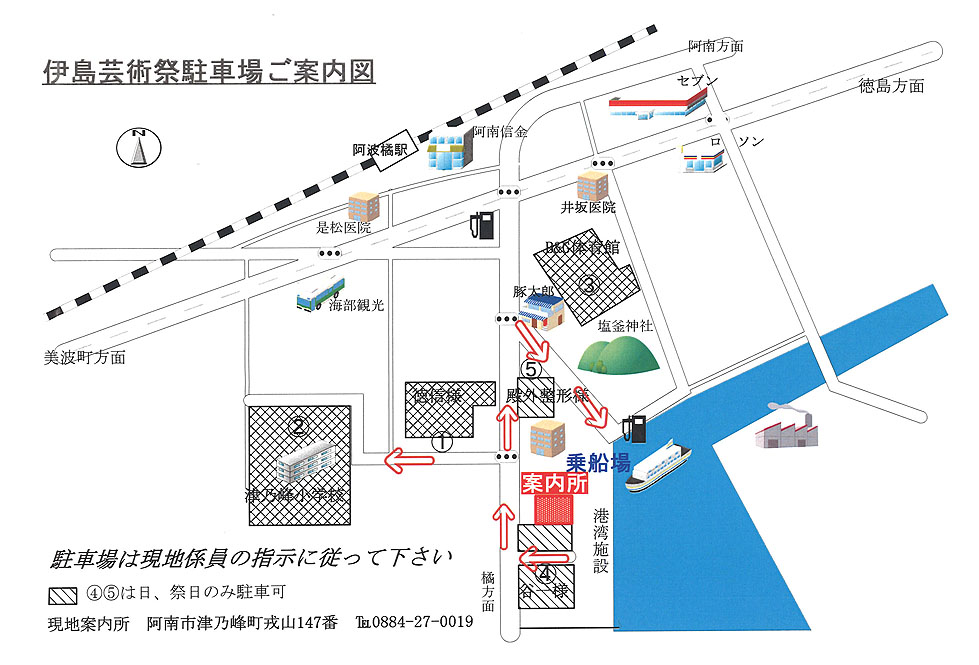 乗船場から徒歩約10分程度の箇所に臨時駐車場を5ヶ所確保しております、駐車台数には限りがありますので、出来るだけ鉄道、路線バス、タクシー等をご利用頂きたく、又マイカーで来島予定者 は乗り合わせでお願いいたします、駐車場の駐車予約等は一切受け付けておりません。